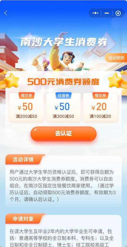 用户通过大学生学历资格认证后,即可获得总额为500元的南沙大学生消费券额度。消费券可以自由组合,在南沙区指定住宿餐饮商家使用。