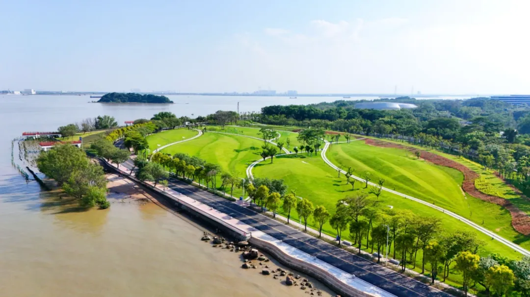 地处虎门水道、凫洲水道、蕉门水道三江六岸交汇处,全长7.4公里,沿路有河外滩地、主题花园、跑步道和自行车道等,有着广州最美观海大道之称,被誉为南沙情侣路的滨海碧道。