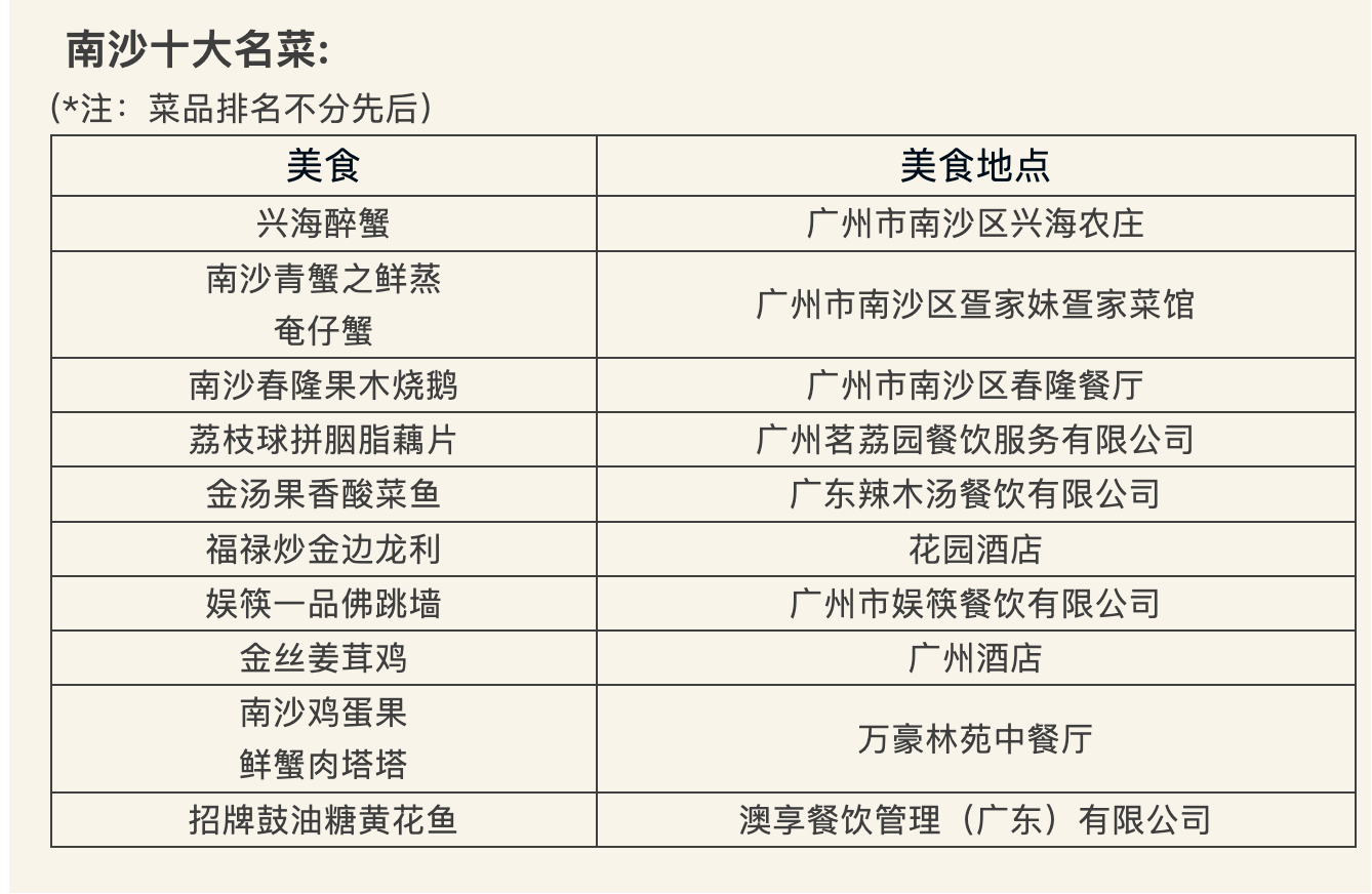 2022年“寻味南沙,粤赏滋味” 评选出的南沙十大特色名店、南沙十大本土名菜、南沙十大名点和南沙十大名特优农产品,