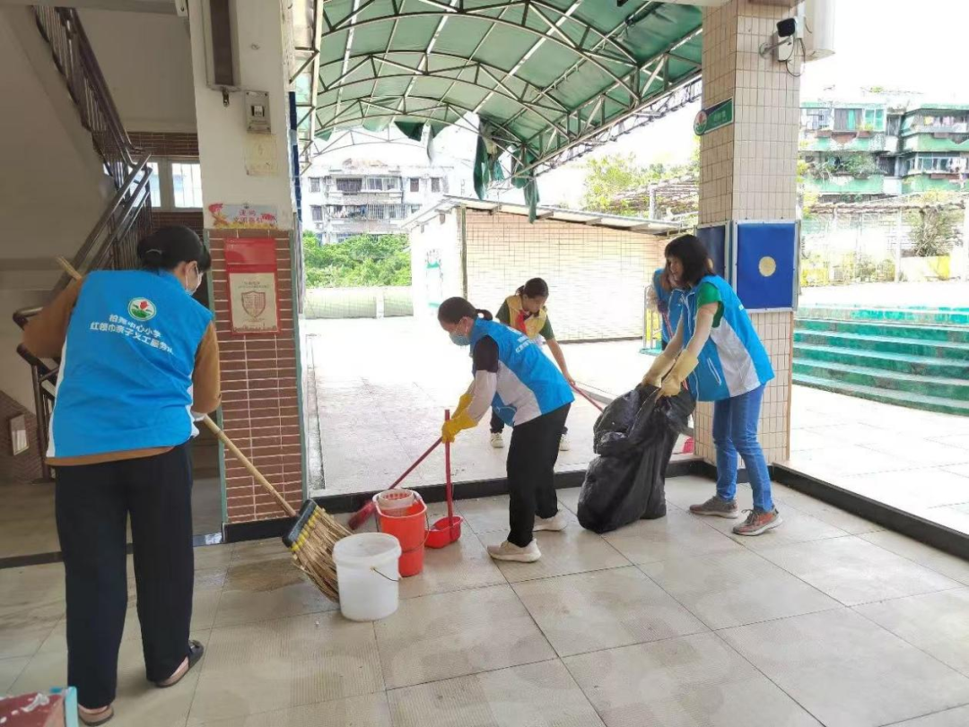 ▲香山小学组织师生及家长义工在校园开展卫生整治行动