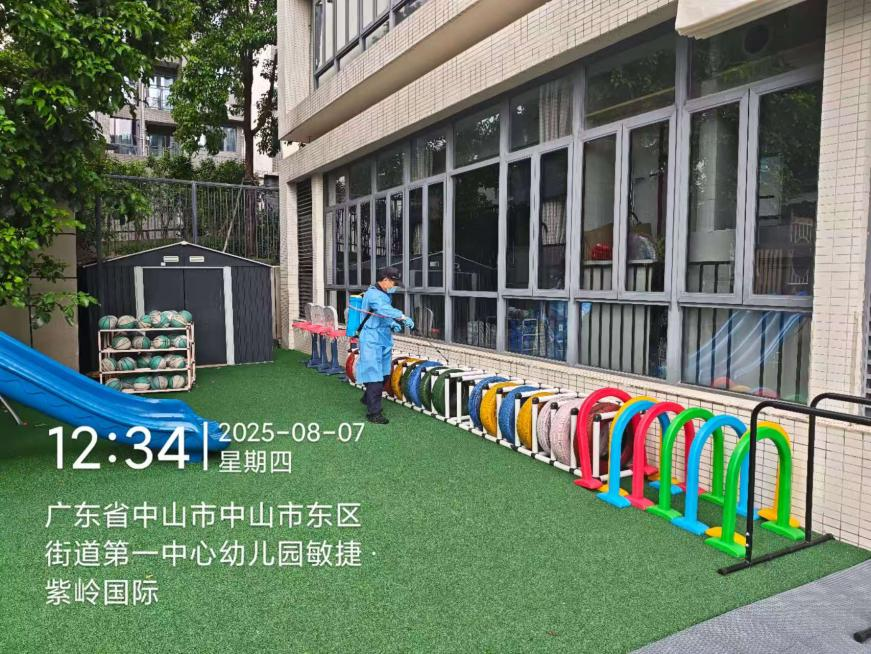 ▲街道第一中心幼儿园进行专业灭蚊消杀